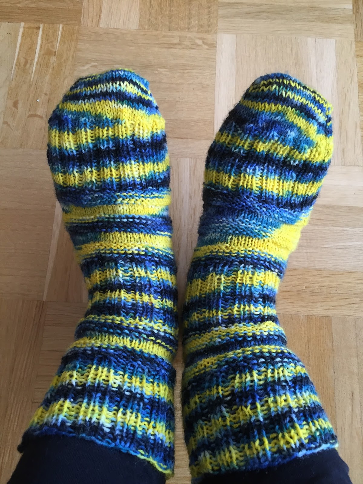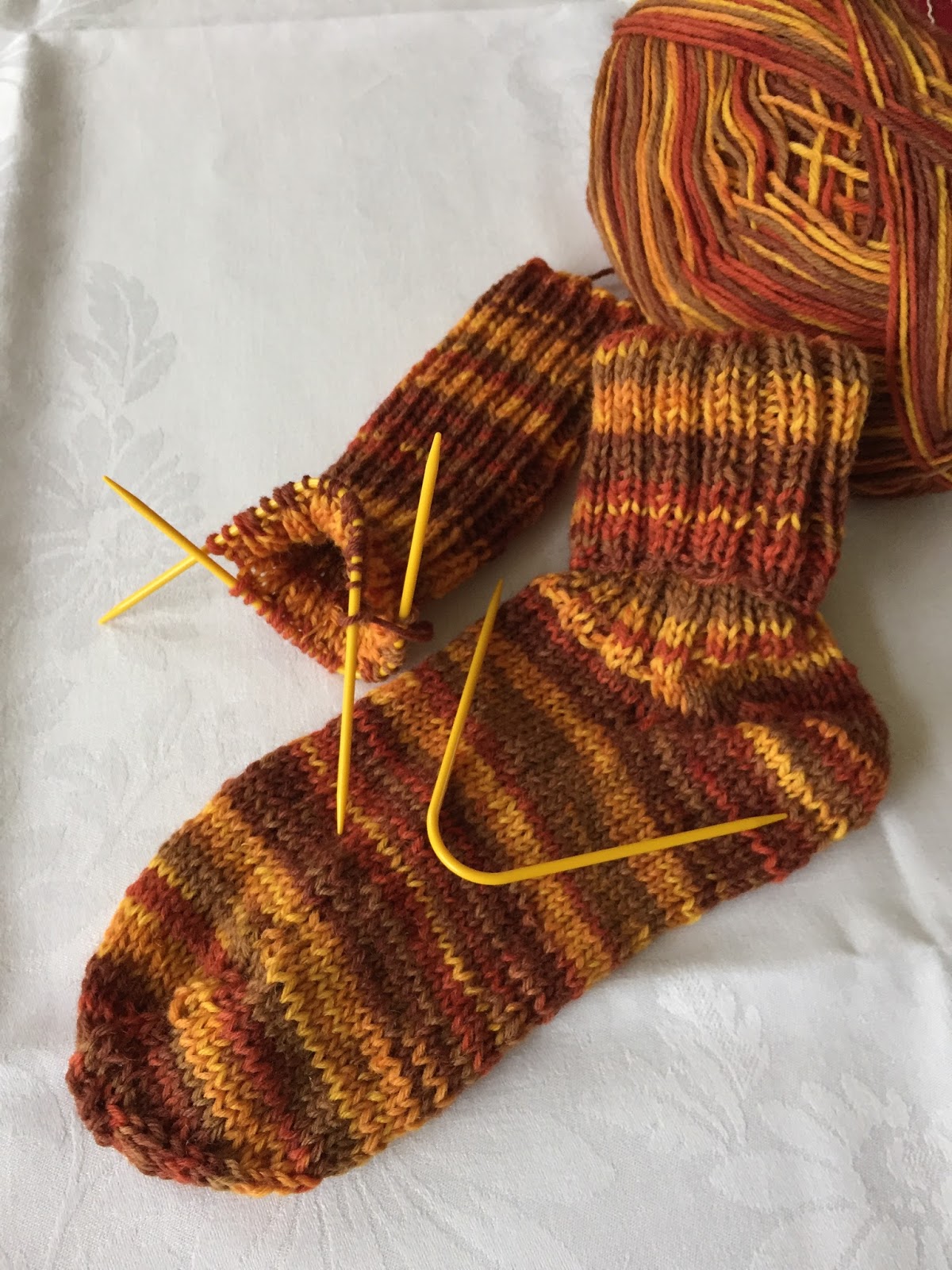 Ich habe mit 6-fach Sockenwolle gestartet und kleine bunte Kindersocken gestrickt. Das hat wunderbar geklappt. Am Anfang habe ich mit ein bisschen blöd angestellt und in der ersten Runde die dritte Nadel ganz vergessen. Mit 2 Nadeln kommt man auch bei den Nekos nicht weit 😀