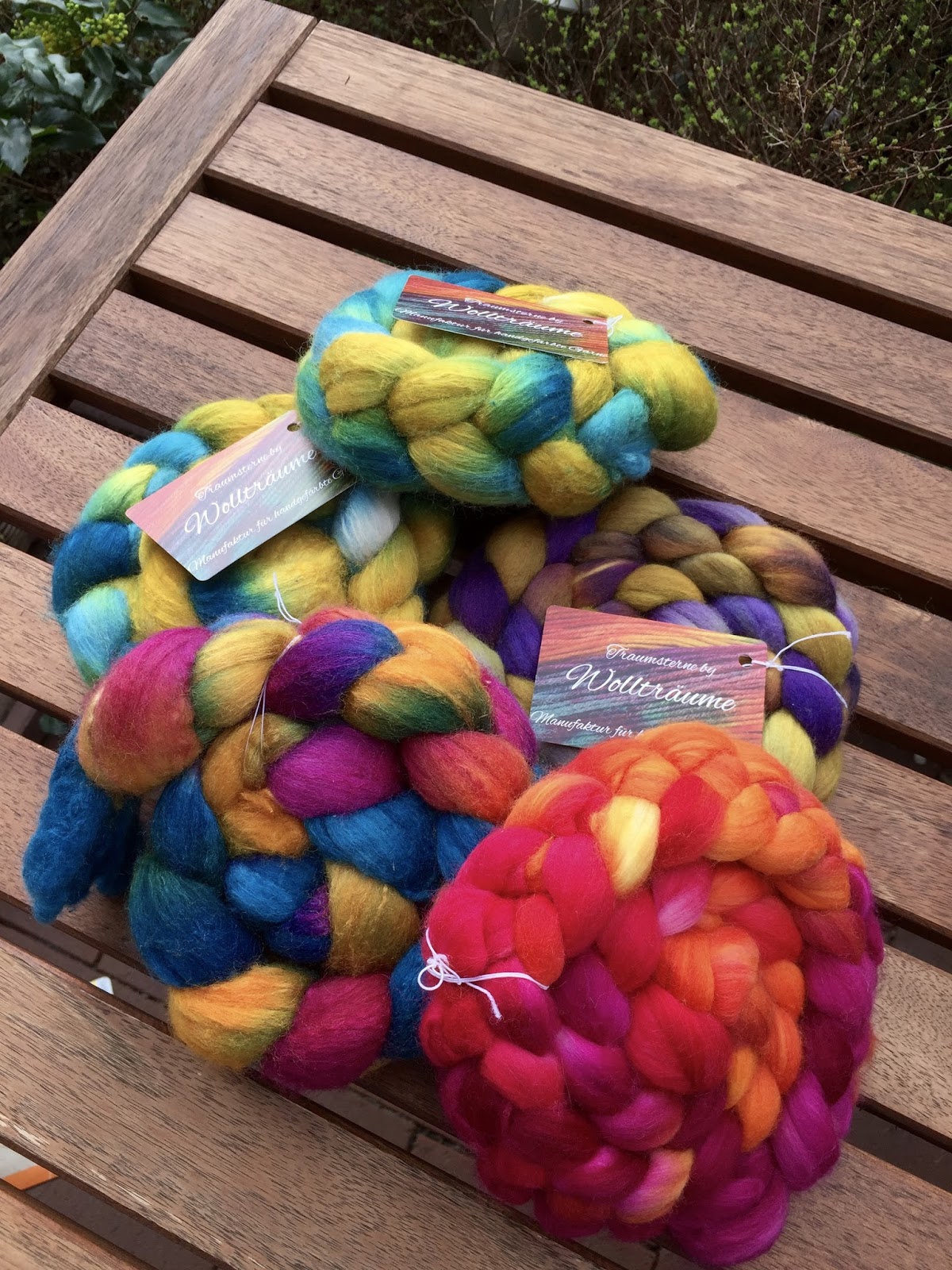 Zum Geburtstag gab es ja einen Webrahmen. Und heute kam dann noch ein Päckchen für meinen Freund an, dass ich öffnen durfte 😀 Und darin waren fün Kammzüge meiner Lieblingsfärberin – Wollträume. Die Kammzüge gibt es in ihrem Shop erst seit kurzem, aber sie sind unschlagbar günstig und ich liebe einfach ihre Farbkombinationen. Lange hatte ich nichts mehr bei ihr bestellt, weil ich mir vorgenommen habe, möglichst nur noch Wolle fürs Spinnrad und keine fertigen Knäuel mehr zu kaufen. Jetzt gibts endlich mal wieder Traumsterne für mich 🙂