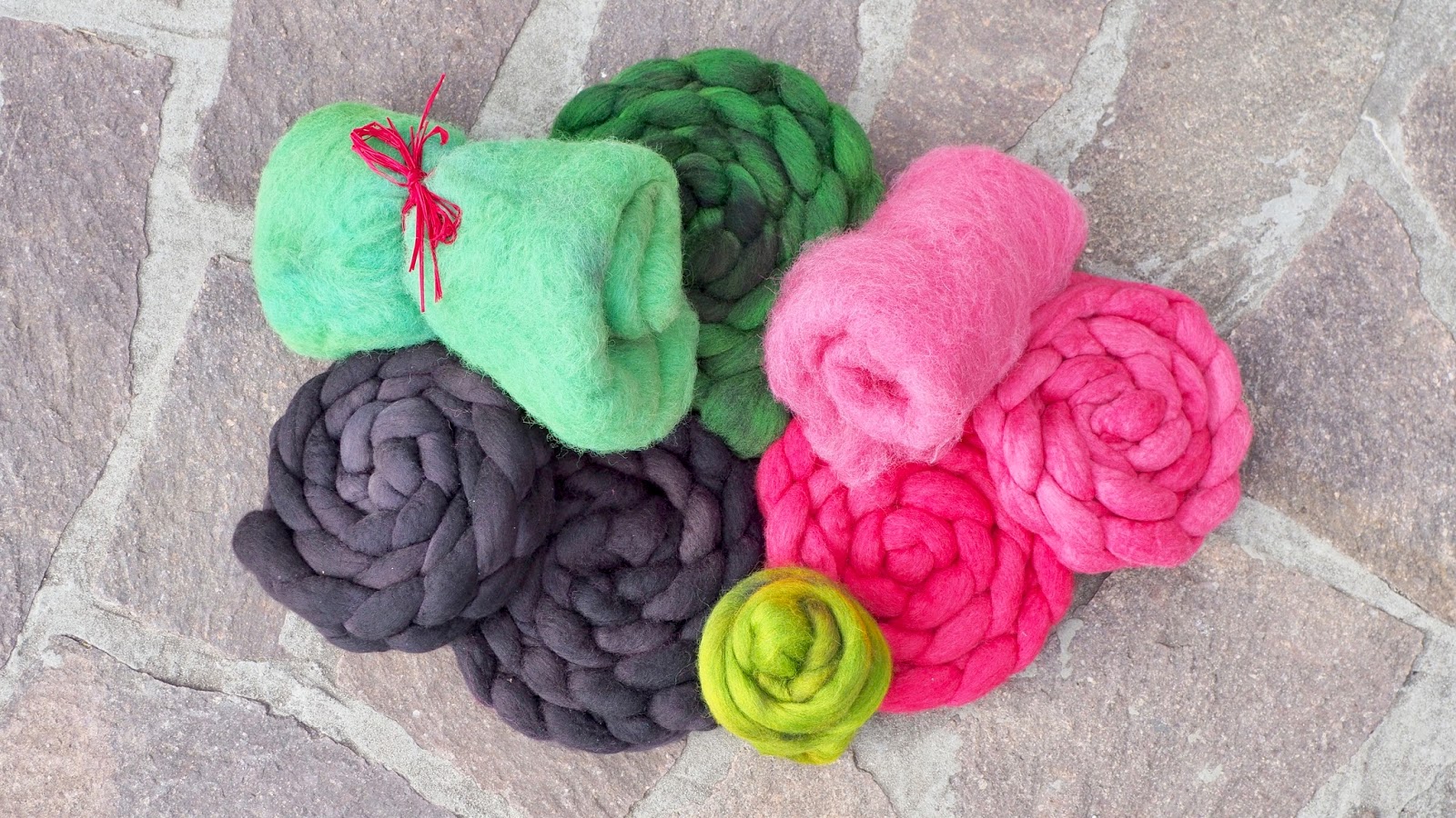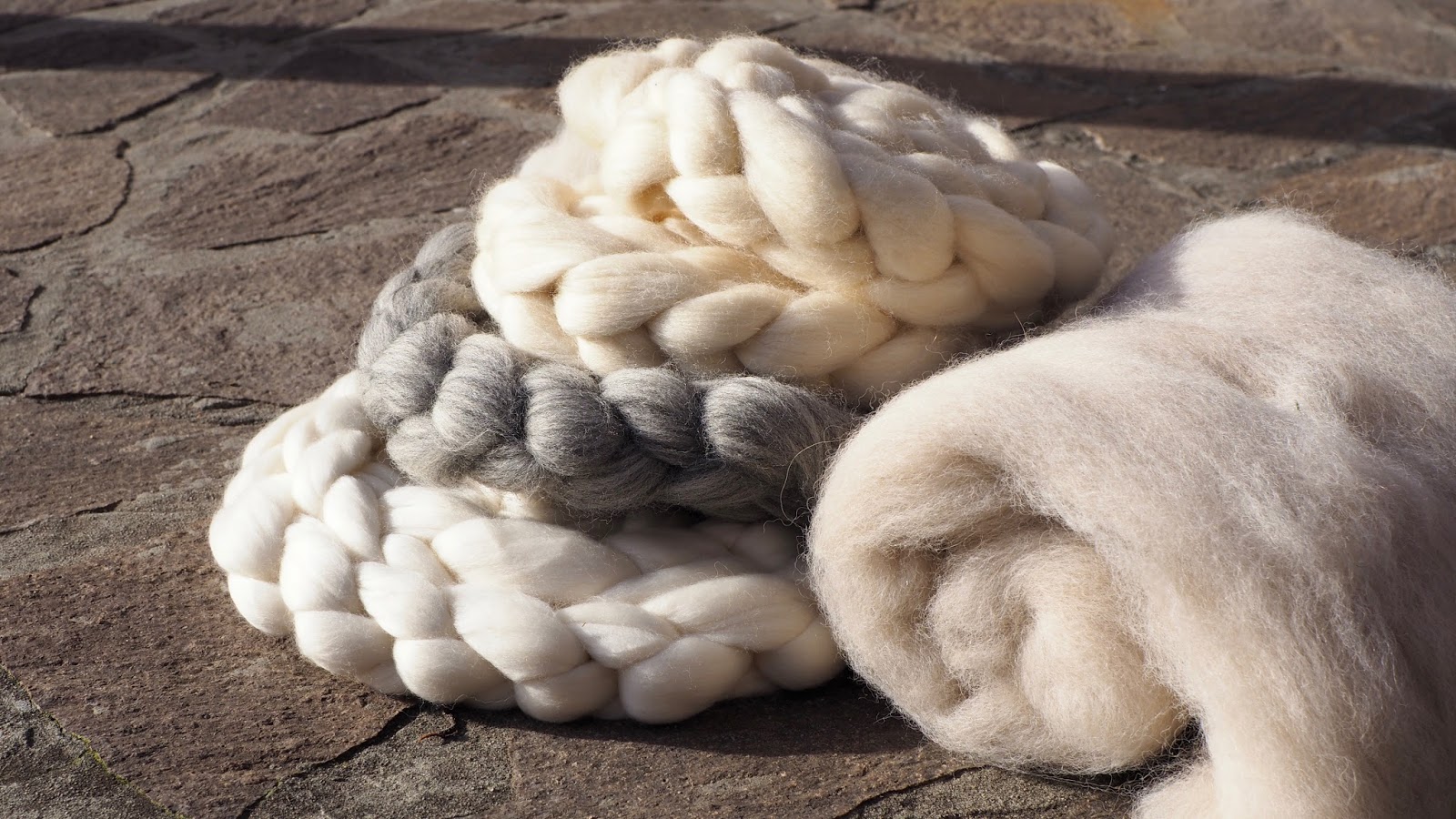 Von links unten nach rechts oben: 16 mic Merino, graue Bergschafwolle, naturfarbene süddetusche Merinowolle und ganz rechts handkardierte Alpaka-Rohwolle. Außerdem (nicht auf dem Bild) habe ich einen kleinen gelben Strang Bergschafwolle mit grün überfärbt. Das Ergebnis seht ihr ganz oben auf dem ersten Bild.