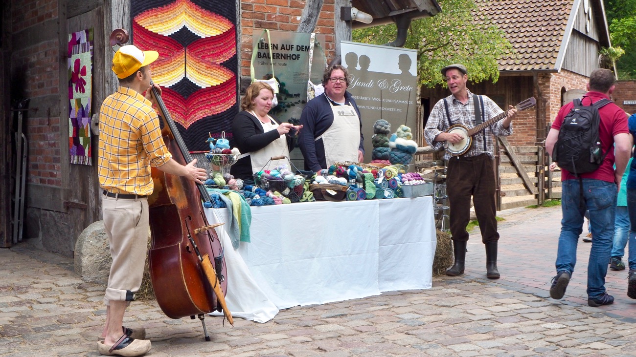Ich habe mich einige Zeit bei ihr und ihrem Mann aufgehalten und eine von ihr gefärbte Landwolle mit meiner Matthes-Kreuz-Kopfspindel versponnen. Wenn ihr genau hinseht, findet ihr sie auf dem Foto. Kinder und Erwachsene hielten an, um sich den Spinnprozess anzusehen.