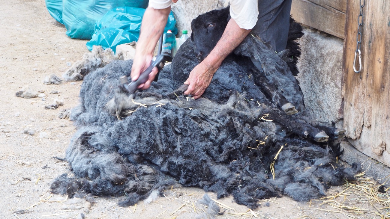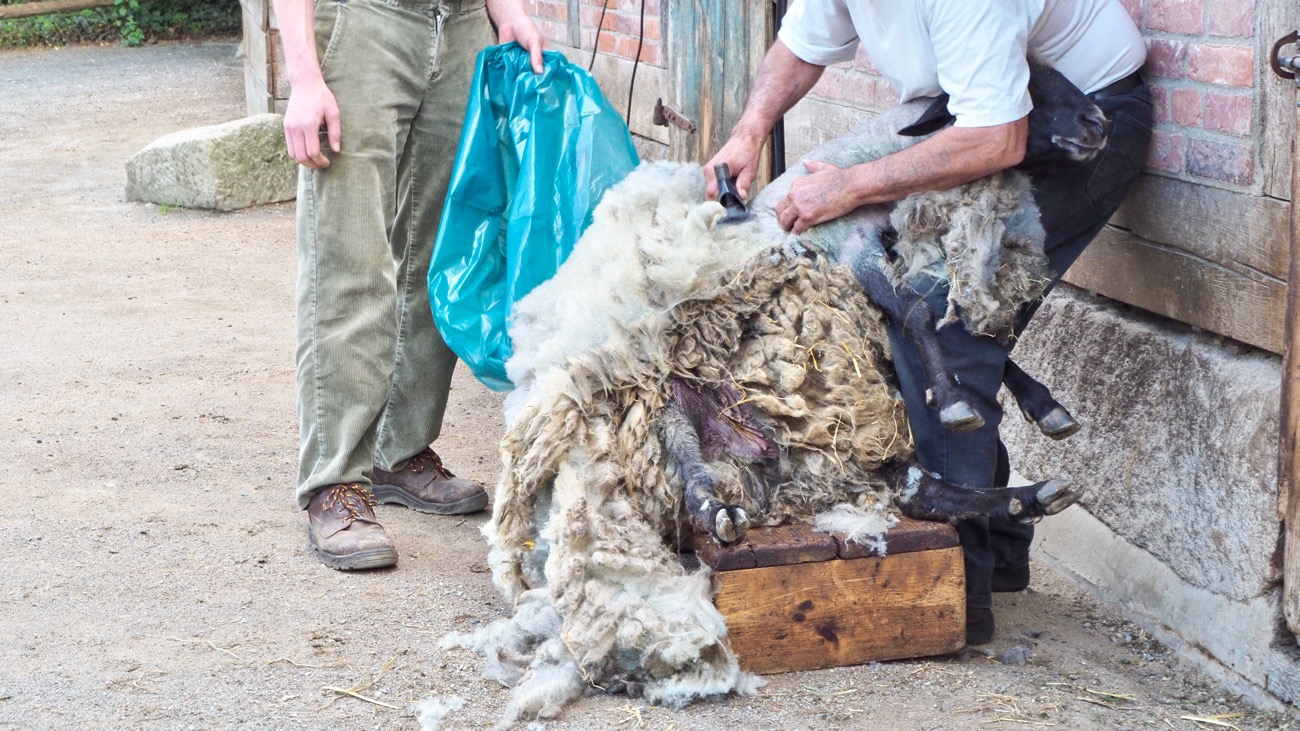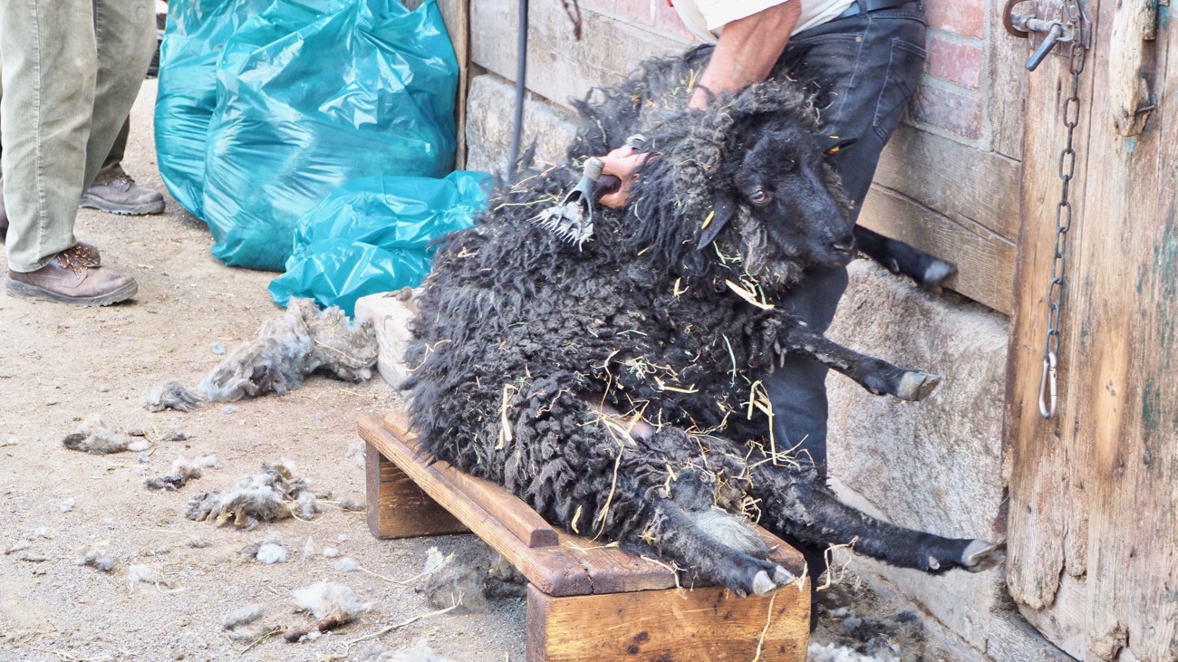 Hier seht ihr einen jungen Bock bei der Schur. Er wurde im letzten Herbst geboren. Er wurde zum ersten Mal geschoren und wir durften sein Vlies mitnehmen. Das muss nun von Streu und Unreinheiten befreit werden. Zu stark verschmutzte Bereiche, wie beispielsweise von der Bauchunterseite, dem Hintern und den Beinen müssen aussortiert werden. Danach wird das Vlies gewaschen, kardiert und versponnen, bis daraus ein Pullover oder eine Strickjacke entstehen kann.
