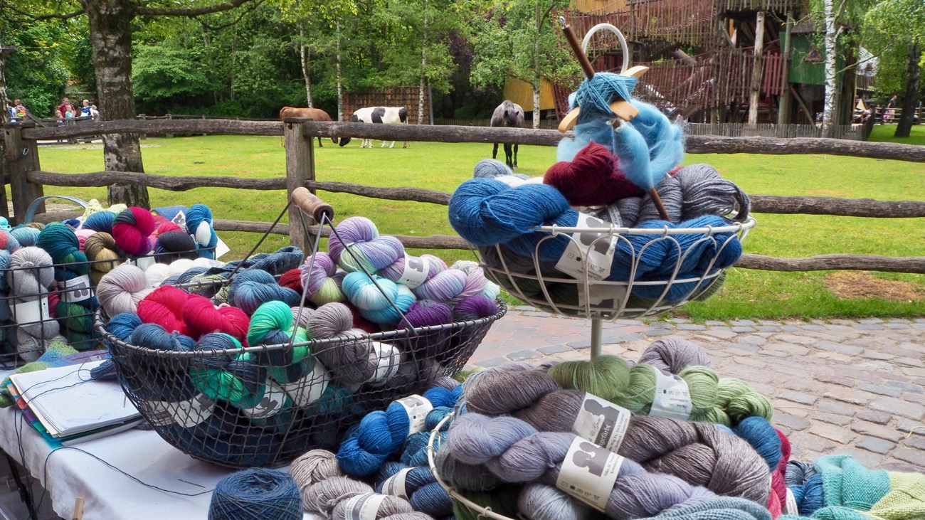 Was hatte ich nun dort zu suchen? In erster Linie wollte ich Silke besuchen, eine befreundete Handfärberin aus meiner Strickgruppe, die auf den Markttagen mit einem Stand und ihrem Label „Yundi&Grete“ vertreten war. Außerdem sollte es um 16 Uhr am Sonntag Nachmittag eine Show-Schur der Schafe geben. Also machte ich mich bei traumhaftem Wetter mit dem Fahrrad auf den Weg zum Zoo.