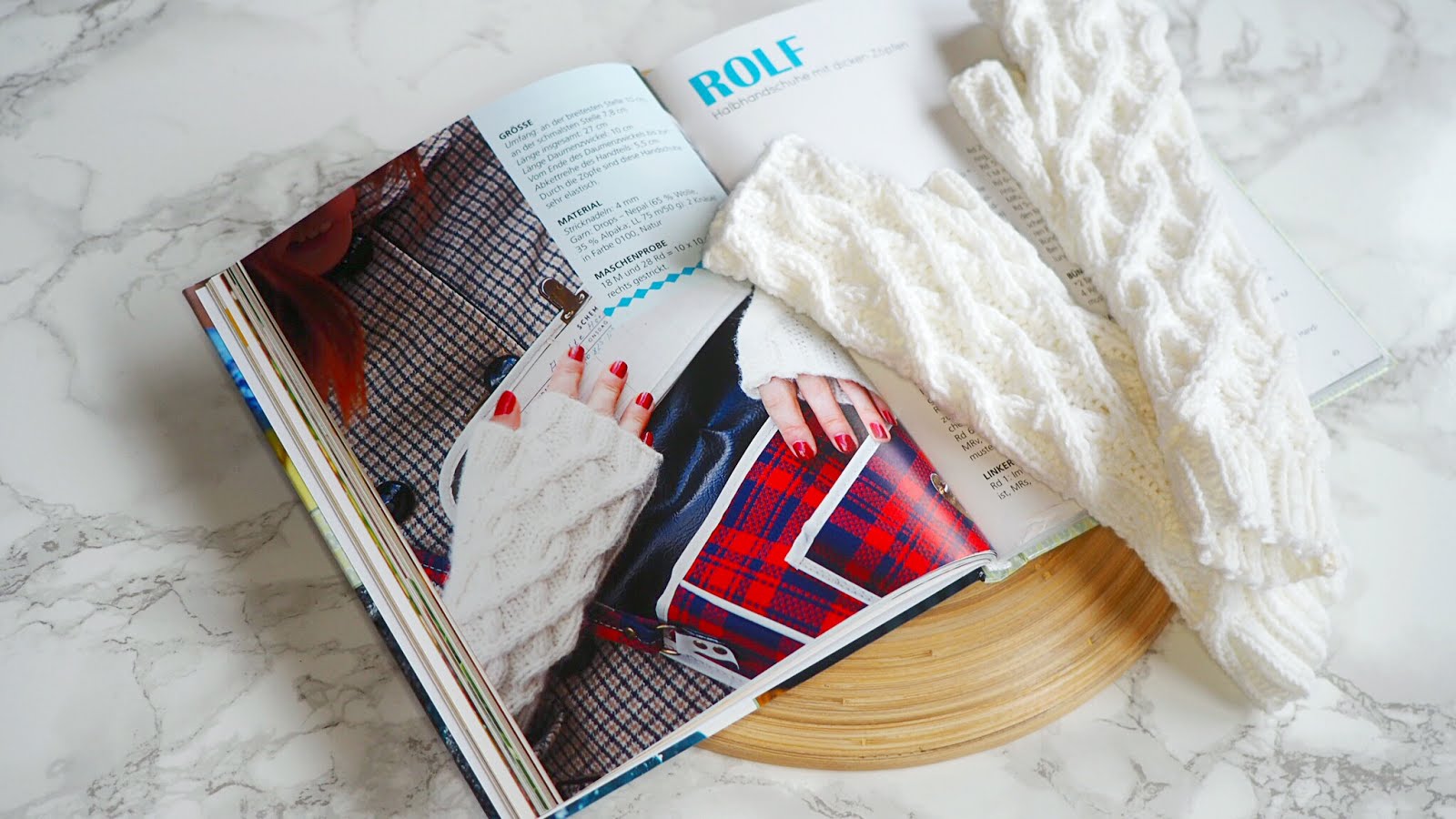 Das weiße Zopfmustermodell auf meinen Bildern stammt aus dieser Kategorie. Die Stulpen heißen „Rolf“ und ihr findet sie auf Seite 48. Angegeben sind bei der Anleitung stets die Größe, das benötigte Material mit Garnvorschlag und allen wichtigen Angaben zum Garn (Lauflänge, Zusammensetzung), eine Maschenprobe und die Schritt-für-Schritt-Anleitung mit Strickschrift. Meine Variante wurde von einer Freundin aus meiner Strickgruppe angefertig (Danke Irma!). Sie hat mir ein bisschen Feedback zur Anleitung gegeben. Die Anleitung war insgesamt gut verständlich, hatte aber ein kleines Manko: Für den rechten Handschuh wurde die Anleitung nicht bis zuletzt ausgeschrieben. Nach Runde 8 sind keine weiteren Angaben vorhanden. Die finden sich dann erst beim linken Handschuh. Für die geübte Strickerin kein Problem – für eine Anfängerin vielleicht Grund zum Aufgeben. Hier wurde also leider nicht penibel genug kontrolliert.